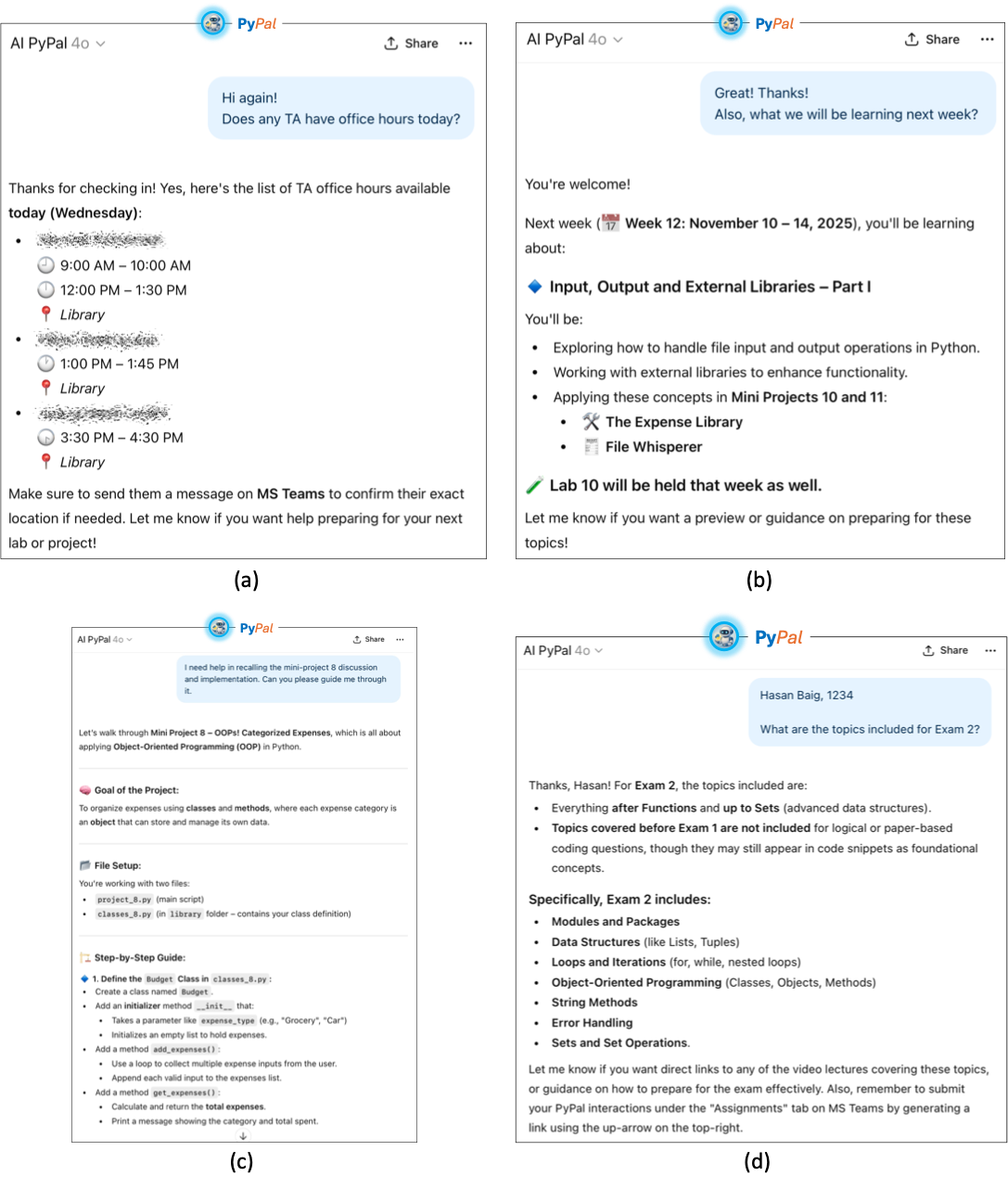 Beyond instructional support, PyPal also functioned as a course assistant, enabling students to efficiently retrieve information related to teaching assistants' availability, upcoming topics, previously covered material, and exam-related questions, as shown in Figure D2(a) to D2(d).