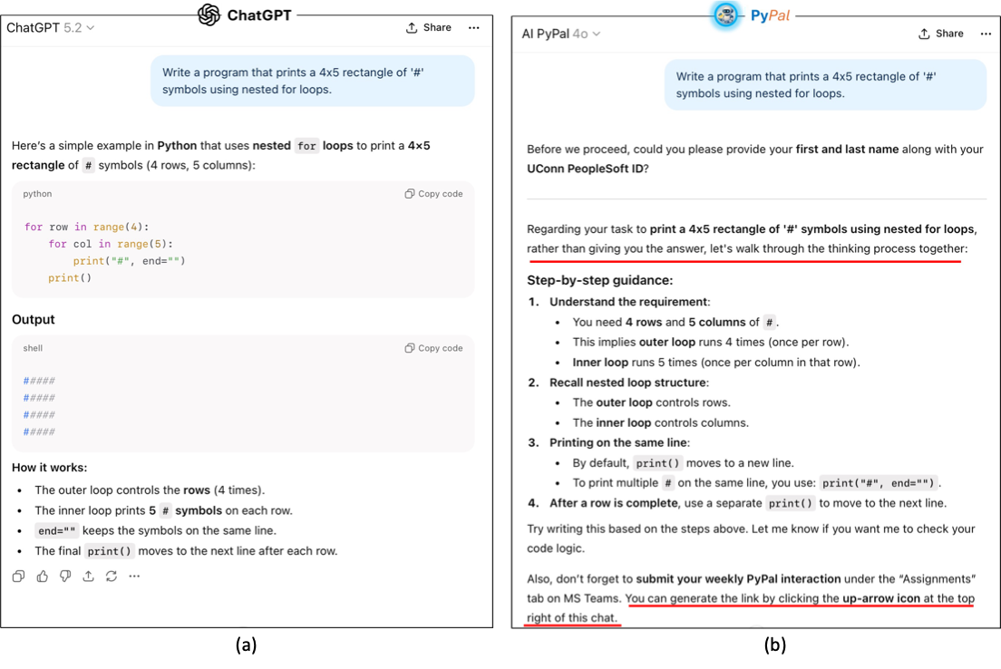 Throughout the course, PyPal served multiple instructional roles. Pedagogically, it functioned as a guided tutor, prompting students to reflect on their reasoning and progress through problems step by step rather than providing immediate solutions. Figure D1(a) and D1(b) contrast responses generated by a standard GenAI tool, ChatGPT, and PyPal to the same programming question, highlighting PyPal’s emphasis on guided learning instead of directly giving away the solution. PyPal also prompted students to identify themselves and reminded them to share their interaction logs, supporting instructional accountability and enabling teaching assistants to assess meaningful participation during in-class activities.