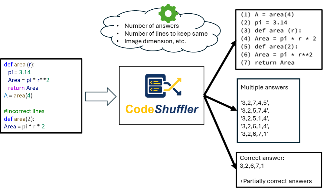 To address this issue, I developed CodeShuffler, a highly original teaching innovation designed to support equitable and authentic assessment of programming skills while significantly reducing instructors' grading workload. CodeShuffler takes an original code snippet as input (Figure D5), shuffles its lines, converts the output into an image, and generates a specified number of multiple-choice options that include one correct sequence of code elements. The tool also identifies the correct answer automatically. Multiple versions of the same problem can be generated by running the code multiple times, ensuring that students sitting near one another receive equivalent but distinct assessments. Importantly, CodeShuffler supports code written in any programming language, making it highly scalable and easily replicable across courses, departments, and institutional contexts.