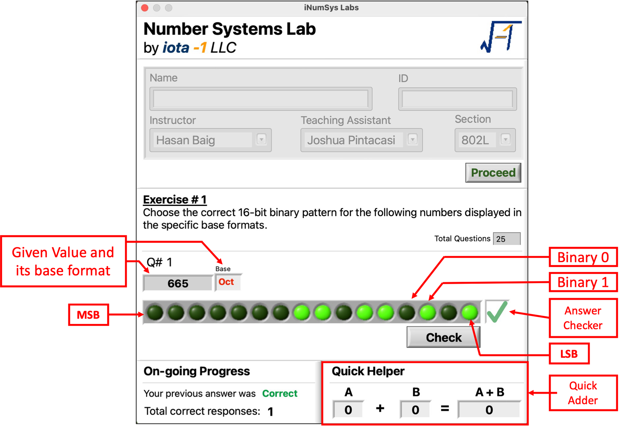 There are two exercises - conversion of a given number (in the specific base format) into a binary pattern, and conversion of a 16-bit binary number into a specified base format. This tool is an updated version of the HU DLD labs tool. The screenshot of Exercise #1 is shown in Figure D3. The software also indicates whether the answer entered by a user is correct or wrong, as shown in the figure below.