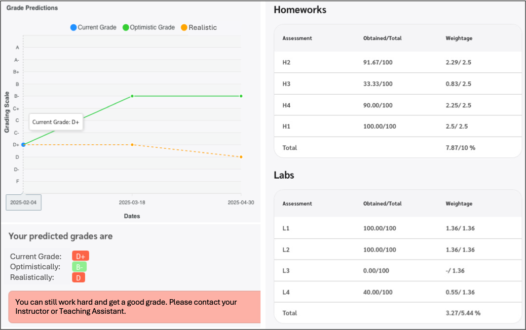 Similarly, Figure 2 shows selected views on the students’ side highlighting their possible grade trajectory; their grades in certain assessments; and a brief message.